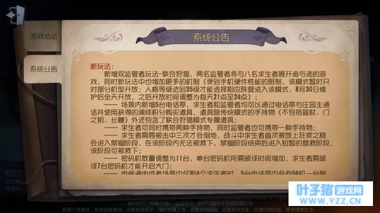 8.30 8:30开始维护 预计120分钟[两个小时]新玩法:新增双监管者玩法联合狩猎,两名监管者将与八名求生者展开追与逃的游同时新玩法中也增加更多的机制(受到手机硬件性能的限制,该模式暂时只对部分机型开放;人格等级达到35级才能选择相应阵营进入该模式,8月30日维护后全天开放,之后开放时间调整为每天21点至24点)