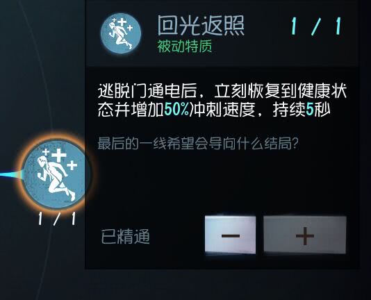 化险为夷:20秒无敌状态,也就是我们常说的搏命挣扎。这个在机子压好了以后或者门已经开了以后,救人非常有用,20秒无敌状态对救人流来说还是的一个非常有用的Buff。