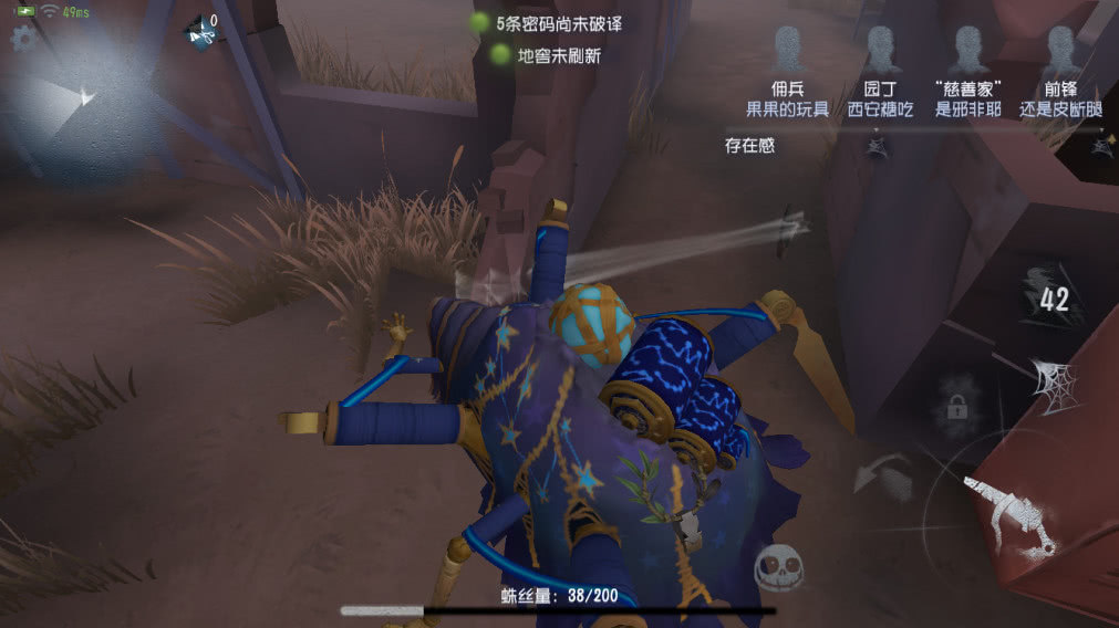 (背不出地图的盲女会自闭) 四.观察力求生者也是需要一定的观察力的,不同角色有各自的特征,小丑局满地的靓仔快乐笋,杰克的雾区,蜘蛛的蛛丝,红蝶的对视,黄衣的触手等等。相应的音效也不同,红蝶小姐姐在攻击时是会有很清脆的声音。在队友受到攻击的时候,也能看到监管者的轮廓。