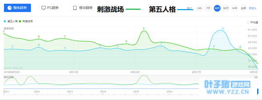 第五人格 而刺激战场是绝地求生端游的授权手游,还原度很高,游戏模式无需多言。在紧随端游版本的同时还有自己的原创游戏模式。可以说腾讯的运营和策划团队还是很用心在做。 我们先比较一下二者的人气,在百度指数给出的数据来看, 第五人格的搜索量略低于刺激战场,在峰值的部分,双方则无太大差异。但是根据平均数据来看,刺激战场的搜索量还是高于第五人格的。