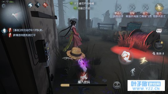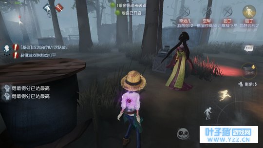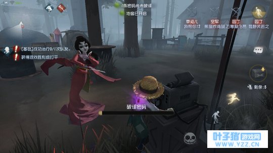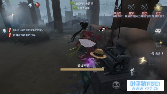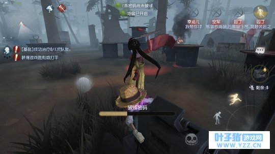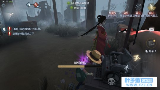 可以看出这位监管者已经杀死三个了,然后到我的时候。她突然把我引到了密码机。我刚开始楞在那。后来鼓起勇气破解。。。。 然后他就在旁边一直注视着我。。。