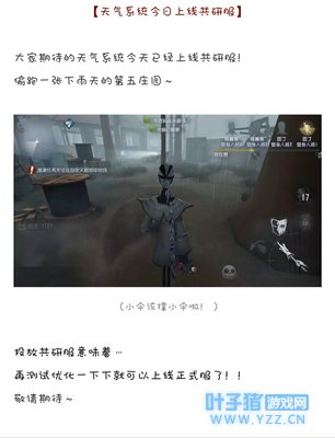 【天气系统】:落雨天气加入庄园,触发雨天后场景中将生成泥潭,雨滴也会让密码机短路,降低破译速度。 你没看错,官方给天气系统落雨效果的解释就这么一句话。首先官方只给出这一句话,就给了他后期更多修改数据的空间,如果正式服也不去标注这些细节,那么,官方将可以无限更改数据,而可以明目张胆的说没有暗改,因为没有解释过。比如降低修机速度是降低多少呢?泥潭降低移动速度是降低多少呢?,什么时间才会触发下雨呢?等等的一些问题,我们就共研服现如今的情况进行一个解读。