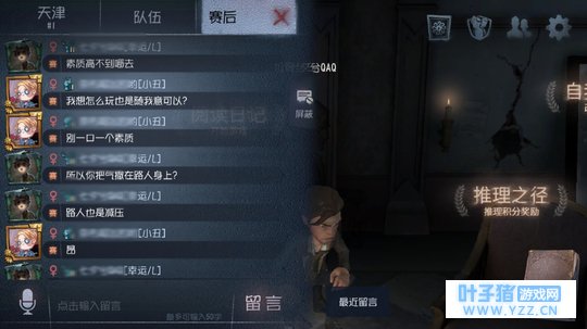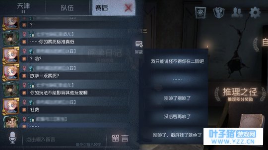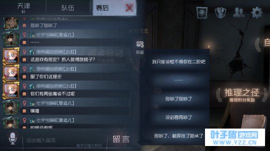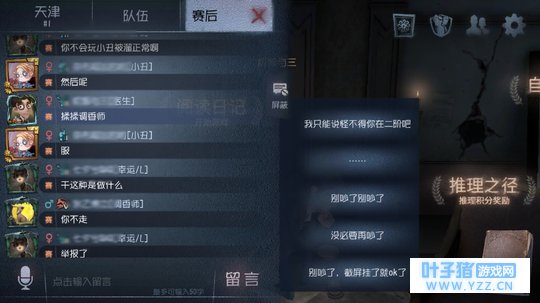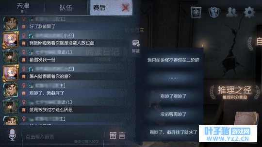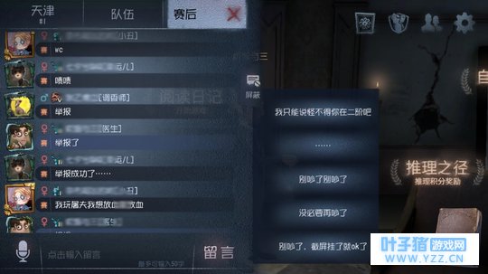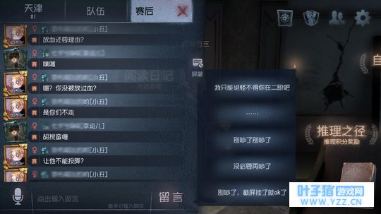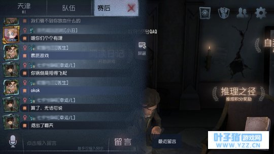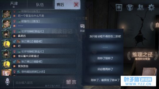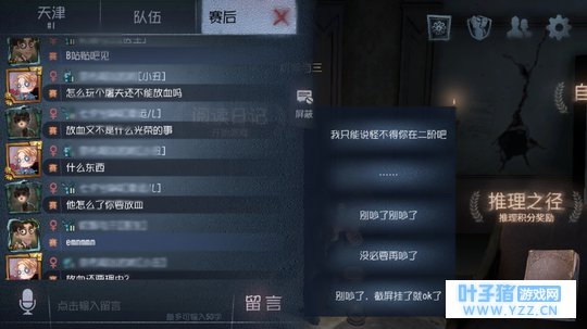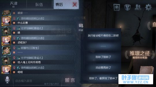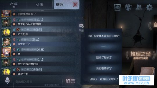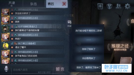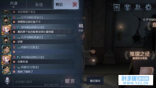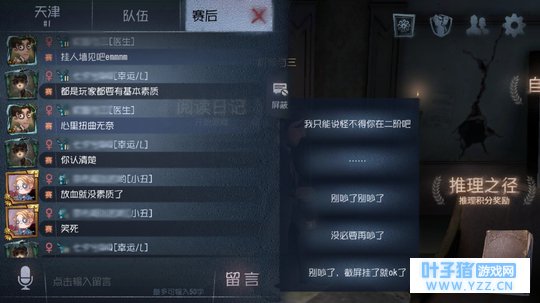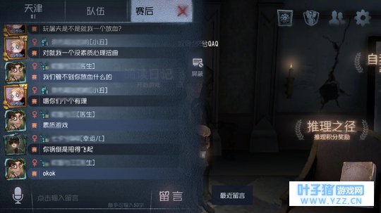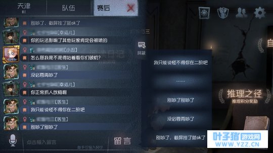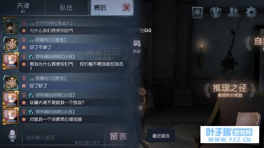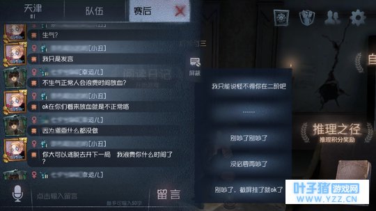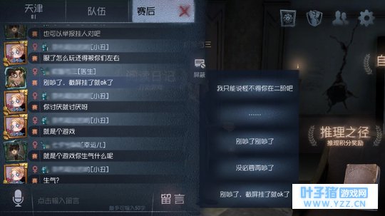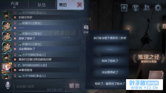 小丑“那就放血死好了” 赛后我和我基友(幸运儿)为调香师报不平 医生为什么不走等调香师放血死and小丑为什么不正常挂人而是放血加做动作并在赛后用略微带有嘲讽的语言 反而被小丑 甩锅 反问为什么不早点走让调香师投降,而我们前面说过。 光天使医生在调香师在被放血的情况下在游街。 以下是 赛后聊天截屏