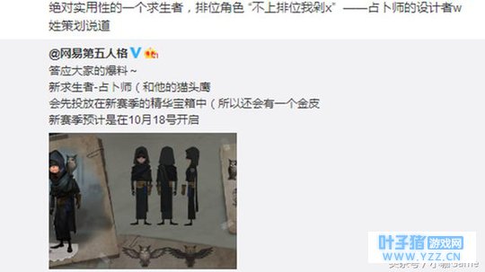 hi,大家好我是小咖 最近第五人格的第16个求生者占卜师也是官宣了,但是因为实在国庆放假期间所有很多玩家都是一脸懵,对于所有的爆料都持有怀疑的态度。但真实的情况就是占卜师将会在本月18号的时候上线,并且这也是第五人格第四赛季开启的时间,所以各位小伙伴还是要早做准备!