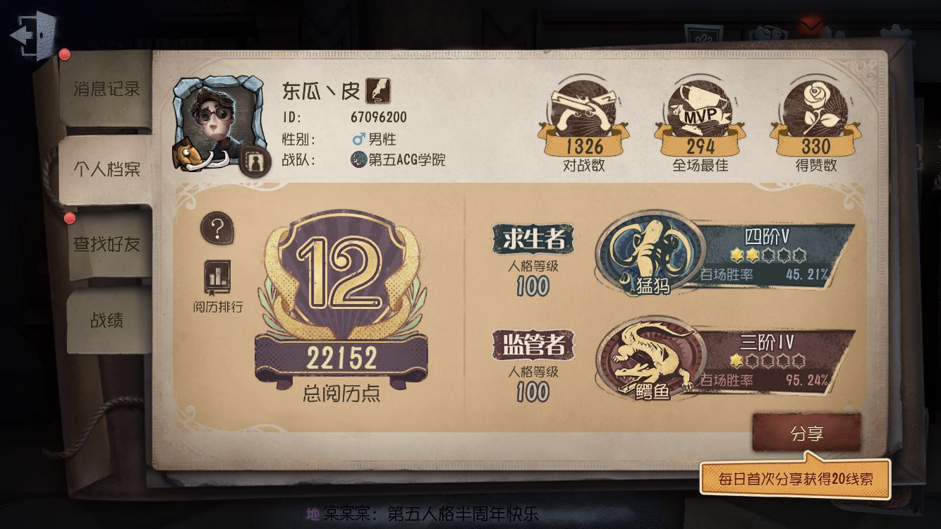 新随从【伟大的亚历山大】 看着这只新随从真的很开心,但是回顾过去几天《第五》给我的感觉却真的不太好。 前一阵子是中秋节,《第五》官方也举办了中秋节活动,送调香师的皮肤,活动也没有多困难,就是每天玩几把游戏就好了。但是这次的半周年活动的难度明显提高了不少,关卡也比以往的多,当中有一些任务很容易引起玩家之间冲突。而且在这次活动里,感觉官方调整过匹配的机制(等下说明),让玩家难受,也增加的不同段位玩家之间的矛盾。