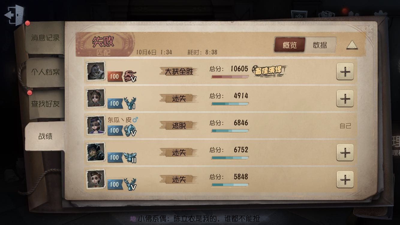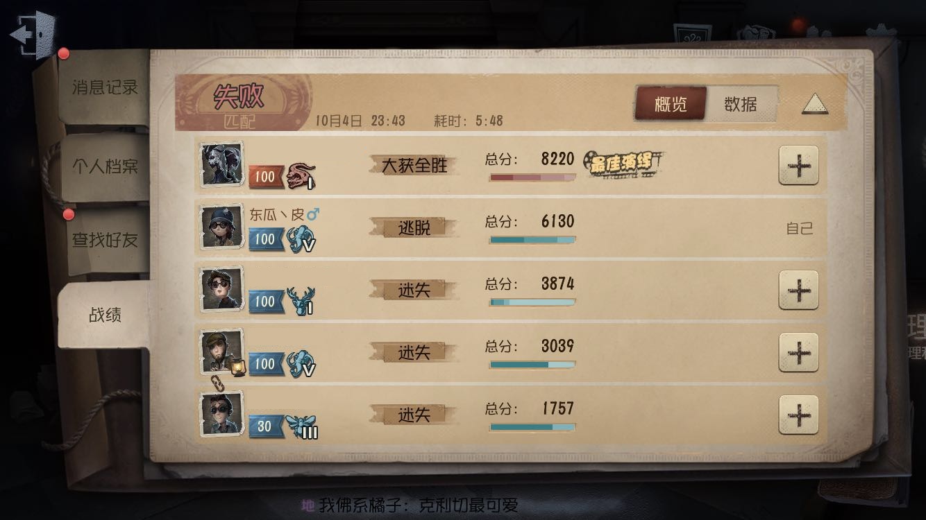 【后话】: 一直以来《第五》最大的话题之一就是「能力不对称」的问题,不单单是屠夫与人类之间能力不对称,人类与人类之间能力不对称,一直都是话题。对单排的玩家来说,玩家能力不对称严重影响了游戏的体验。经过我好几个月的体验,得出来的答案是:无解的。毕竟匹配的机制权全在官方手里,官方要怎样调整这条方程式,玩家也是无权过问。但是上分的技巧还是有的,恳请留意下一篇专栏《单排玩家如何稳定站在四阶五(暂定)》。 如果不是排位,匹配对局不应对队友要求太高,匹配的玩家各有不同的目的,有的为了开心,有的想练习角色,有的做推演,有的赚骰子。所以调整自己的心情和心态也是很重要的。 如果想找一起练习的同伴,匹配和自定义SOLO,都可以加我(加好友备注注明一下)。排位就只能随缘,因为我不一定抽到时间打排位。我对2v8的玩法没多大兴趣,所以暂时都是专注于基本的1v4玩法。