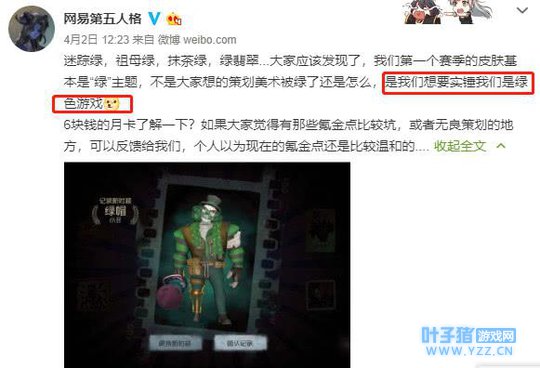 对于官方执着于绿色这件事情来讲,不仅仅是玩家知道,连同官方自己也是知道的。官方也早在第一赛季的时候就说过自己已经要被玩家实锤是绿色游戏,确实!现在的第五人格都已经被玩家叫做第五绿格了,感觉玩家们又重新给游戏定义了一个新名字。