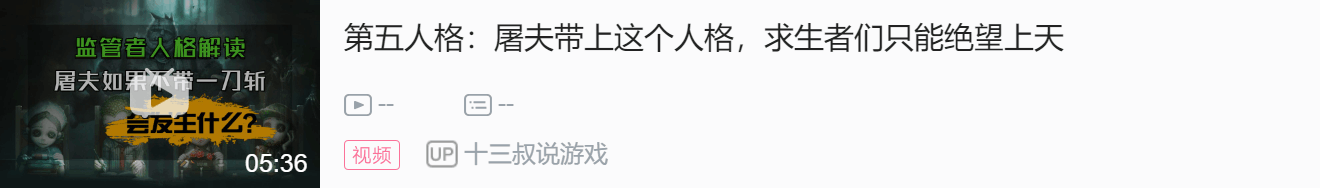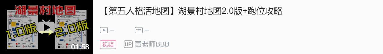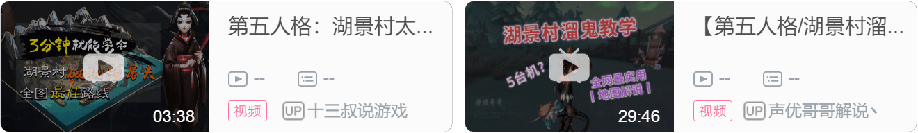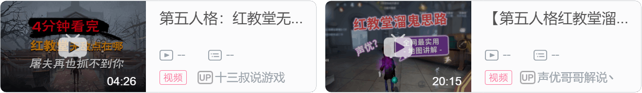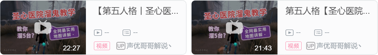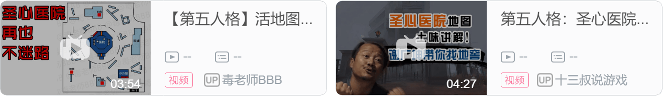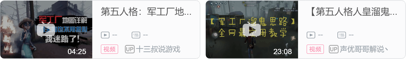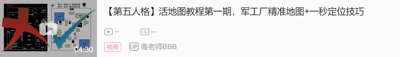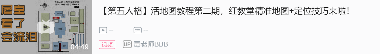 1、本文是B站的D5UP主的教程合集,非本人作品,本文把部分技术硬核的UP主的视频搬到这里,便于萌新学习。 精力和篇幅有限,该文章包含的UP主数量有限 ,还请包涵。 2、本文受众为 萌新 ,对大佬帮助不大。 目录: 一、地图篇 1、军工厂 2、圣心医院 3、红教堂 4、湖景村 5、月亮河公园 二、角色篇 1、求生者人格加点 2、监管者人格加点 3、监管者进阶教学 三、擅长特定角色的UP主介绍