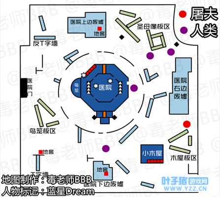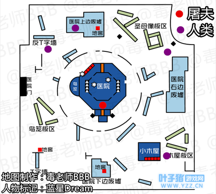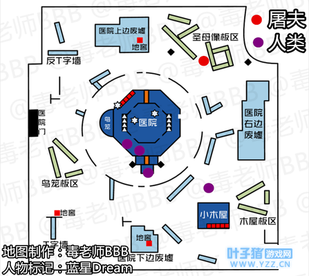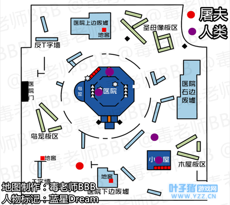 大家好,这里是蓝星呀。今天给大家分享一期圣心医院监管者与求生者出生点的分享。按常理来说普通玩家玩个两千局游戏就差不多就能感觉出人物的出生点了。可毕竟玩这么多局的玩家占少数,所以由我来给大家分享简单快捷的速成秘籍。地图制作@毒老师BBB。