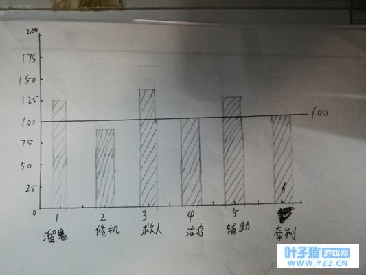 空军因为有一个debuff是需要队友在椅子上才能触发的,所以用波浪线表示间接buff,空军因为现在有能多次攻击的角色所以救人能力并没有以前强,但是依旧不弱,牵制150到175之间是因为园丁是125,空军比园丁只多了百分之20的坐椅子时间,因此150到175之间。