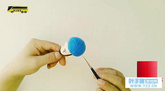 7、再处理下帽子的细节,帽子后面是有一块儿····这是什么我也不知道,反正照着做就行了,蓝色的轻黏土擀片晾至半干,剪成方形粘在后脑帽子的边缘。对,就像这样。