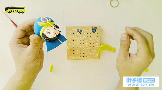 11、把黄色的羽毛粘在帽子上,因为这个羽毛是有铁丝的,所以直接插里就可以了,但要注意,因为整体里面还没干,所以要用一点点新泥做胶,在暗处粘好,这样它就不会动了,最好这时不要再做其它工作了,等着这个组件链接好,也可以最后做这一步,这样就更结实了。