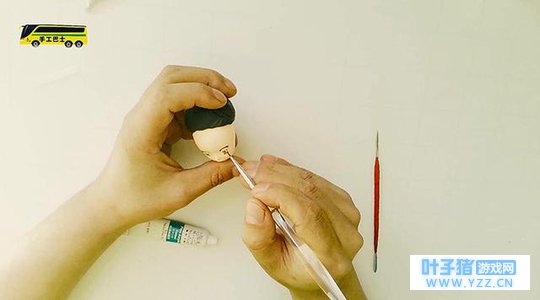 3、肉色的轻黏土搓小球粘在两侧,做他的耳朵。接下来的操作大家注意手尽量不要碰到耳朵,不然你就等着哭吧。然后再用黑色的轻黏土给他粘上胡子,胡子就按游戏里的人物那么粘就行,再用尖的东西戳出细节,这样就更像了,之前发布过相关的视频教程,欢迎大家参考交流。