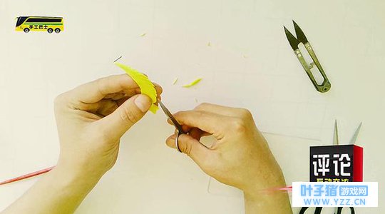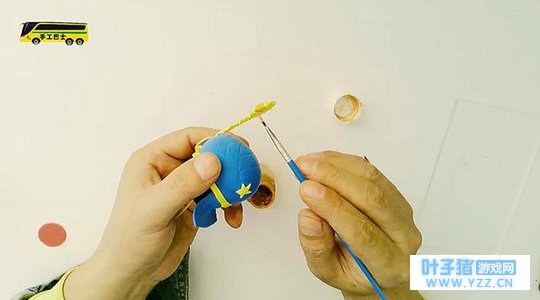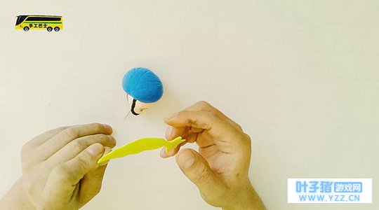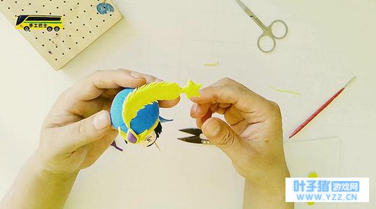 5、这一步呢,我们就准备做他帽子上的羽毛了,想了想还是用铁丝吧,这样会比较结实,铁丝掐短,然后包上黄色的轻黏土。顶端捏出一个五角星,下端压扁弄弯晾干备用。等干了咱再剪碎边缘,做帽子上的羽毛。
