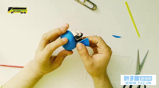 4、在他头顶黑色的轻黏土上包上一层蓝色的轻黏土,做他的帽子。在用美工刀刻画出帽子的纹理。轻粘土有回弹的特性,压痕时大家可以深一点压着,这样成品干了后效果还是可以的。