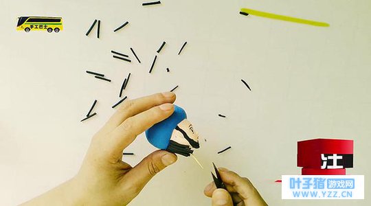 6、来来来,咱开始做他的头发,其实这一步应该先做的,我第一次做没有经验,伙伴们最好是先做出头发,干了后再做帽子,这样更合理一些,我们用黑色的轻黏土搓细条剪断,均匀的粘在他的后脑,这样阿拉丁的头发就完成了。