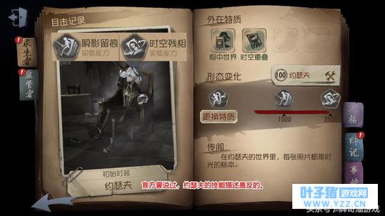 首先约瑟夫这位监管者,他的技能有瞬影留痕和时空残相。目前在游戏的监管者报告中这俩说明是反向的,准确来说应该把它调换成时空残相为1000存在感,瞬影留痕为2500存在感。这样看着就舒服多了,接着外在特质自带的时空重叠有着一刀斩的功能,只要被砍一刀的期间,不管是自己治疗还是队友治疗都等于是浪费时间。因为治不治疗都是一击倒地。