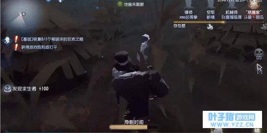 首先利用耳鸣的被动发现周围有人,接着针对关键点进行巡查,发现一个蹲在墙角卡视野的慈善家,要知道监管者可是第三人称视角的更何况在如此漆黑的环境里一眼发现慈善家的位置虚伪的眼里可谓洞察一切。