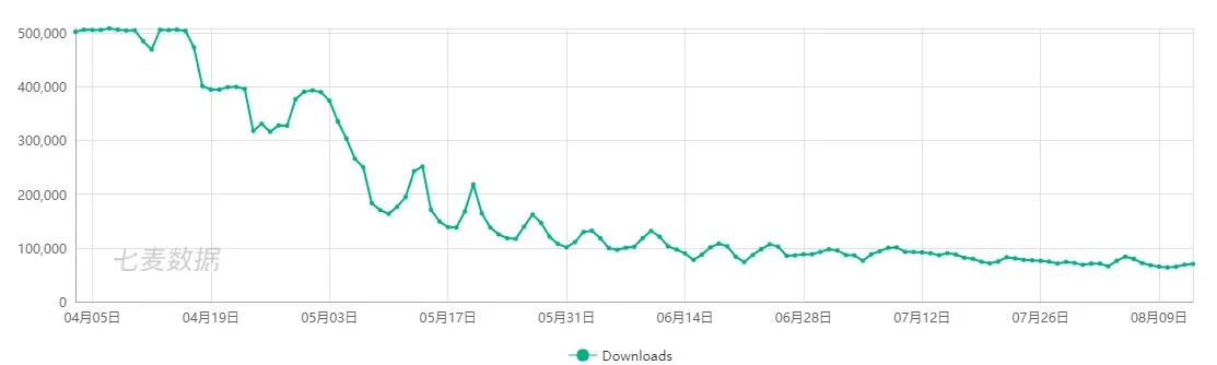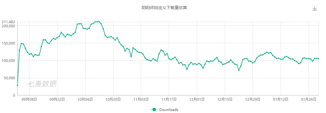 第五人格和阴阳师搜索对比(来源百度数据) 我们在看一下下载量的对比,跟据七麦数据网提供的数据显示,阴阳师近30天的日均下载量在1w次左右,而第五人格近30日的下载量均超过10万次。考虑到第五人格才上架四个月,明显处于爆发式增长趋于稳定的阶段,这样的对比明显对阴阳师不公。笔者又收集到了两个游戏刚上架四个月的下载量数据。