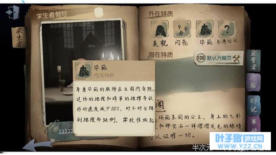 生活在衣来不用张口饭来直接张口的环境,没有接触过点击,导致一直效准,失败则会倒退百分之五十 因为过于美丽导致监管者恐惧,使监管者打她要用更大的力气,所以监管者的嫉妒导致只能抗一刀。
