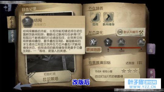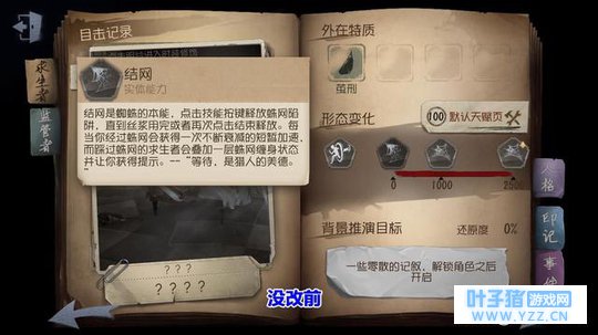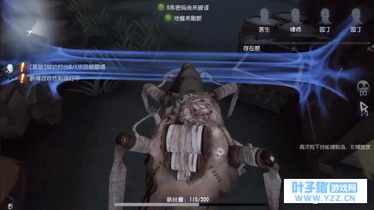 2、吐丝:咱们之前的吐丝只有减慢速度而言,而现在新版的不仅能减慢求生者的速度,还增加了0.5的伤害。只要吐丝命中四次求生者就会直接倒地,所以求生者们一定要利用障碍物来躲开吐丝的攻击哟!再来就是吐丝的升级版,他叫喷网。原先是长按技能键喷出厚网,命中后直接是3层蛛网缠身,改版后吐丝动作更快消耗蛛丝减少。