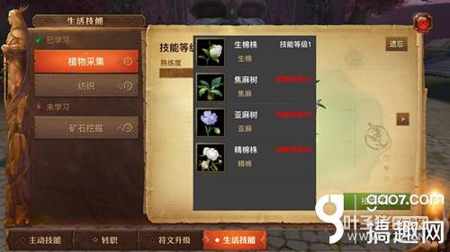 随着服务器等级的提高,游戏中PK的现象也越来越频繁。小编还是比较善良,见不得什么腥风血雨,只好偷偷的去美眉那就职生活职业。 不抱怨了接下来切入我们的正题 生活职业分别是纺织,矿工。这只是我个人对生活技能的定位。 一、纺织技能 看过网游小说和玩过MMORPG类型游戏的人应该还是比较熟悉,纺织:顾名思义是指纺纱与织布的总称。 主要依靠采集大量的植物原料进行半成加工。好的植物原料会随着玩家采集术的提升而慢慢解锁。 每一次采集会有少量的技能经验点,用于技能等级的提升。采集点可以通过资源探测找到,要主升生活技能的可以将体力点全用光。