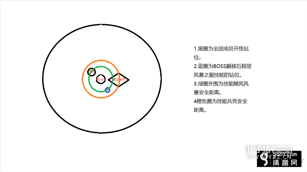 BOSS技能介绍: 技能1:同生,单体伤害,两名队友之间产生一条绿色连线,对这两人持续造成伤害,3秒不解必死(中连线的两人重叠站在一起连线消失)。 技能2:共死,单体伤害,两名队友之间产生一条红色连线,对这两人持续造成伤害,3秒不解必死(中连线的两人分开最远距离连线消失)。 技能3:阴影风暴(技能名字记不清楚了),向前方释放一个龙卷风,逐渐分散成三个龙卷风,分别向前方路线上的玩家造成大量伤害(距离单体伤害,远离BOSS一段距离可以躲避)。 技能4:暗影之球(技能名字记不清楚了),向前方随机目标释放三个暗影之球,落地时造成大量伤害(距离单体伤害,远离BOSS一段距离可以躲避)。 技能5:风暴之眼(技能名字记不清楚了),BOSS瞬移到场地中间附近,释放一个全屏技能,对风暴外围的玩家造成伤害(站在风暴中间可以免受伤害)。 技能6:飓风风暴(技能名字记不清楚了),BOSS站在原地不动身边出现一个红色十字,以自身为中心向周边释放无数个小型龙卷风(这个技能很好躲的,不要站在红色十字内,龙卷风出现后会在地上显示小红圈,移动较缓慢,此技能中一次,就无限晕到死,所有人最远距离输出治疗,战士也站在外围等BOSS释放完技能,第一时间拉住BOSS即可)。 队伍配置:1MT,2治疗,7DPS 通关攻略:开局站位(如图),MT在BOSS当前位置开怪,让BOSS背对人群,其他所有团员重叠站在一起,等同生技能出现后,迅速散开(如果同生点的MT,中连线的另外一名团员迅速跑向MT,反应慢的话,团扑重来,不要浪费时间),同生结束后,BOSS会连续释放阴影风暴和暗影之球,所有人在治疗范围内移动输出和治疗,MT也需要移动拉怪(MT顶着伤害拉BOSS的话,由于阴影风暴和暗影之球间隔极短,治疗肯定来不及加上,也是直接导致倒T的原因。 下一个技能就是风暴之眼,以这个点为中心(如图)散开站位,BOSS瞬移后开始释放技能大家迅速跑向BOSS开始疯狂输出,BOSS技能释放完后. 接着就是技能共死,这个时候需要大家分别向不同的方向跑开,一定不要有人重叠在一起,迅速散开即可(该阶段会极易造成减员)技能共死结束后就是飓风风暴,大家远离BOSS输出和治疗,MT在站在外围,注意等BOSS技能消失后,第一时间上去拉住BOSS,BOSS马上又开始释放技能同生,所以其他所有人迅速以一名队员为中心集合重叠站(该阶段会极易造成减员),这就是此BOSS的一个技能循环。 [编辑:叶子猪小秘书]