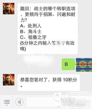 问:战士的哪个转职选项更倾向于招架、闪避和耐力? 答:B (角斗士) 光明大陆战术三个转职职业特点: 处刑人:暴怒的近战输出职业。获得转职技能饮血,可以对单一目标造成大量伤害 角斗士:坚毅的防御者,用手中的盾牌构筑可靠的防御,获得职业技能角斗士之心,获得护盾并且造成范围伤害。 祖鲁之牙:久经沙场的战斗大师,擅长从中距离创造优势局面。获得职业技能神力枷锁,将目标拉至自己身前并造成大量伤害。 -------------------------------------------------------------------- 请玩家选择未满的群加入,玩家交流,谢绝广告。