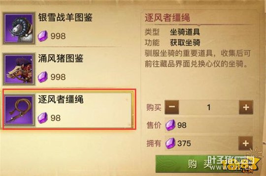 逐风者缰绳是用来兑换坐骑的重要道具,可通过商城购买98晶石个。 [编辑:叶子猪小秘书]