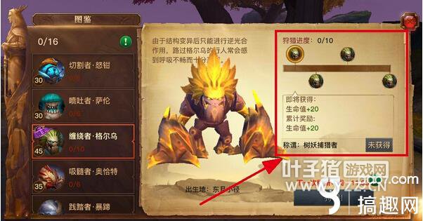 领主boss的头像左上方会标注“领主” 任务领取:普通首领——无需接取任务;领主——需找“风语者猎人”探听位置,风语者猎人会随机刷新在领主出生地附近 次数上限:普通首领——2次/天;领主——1次/天 二,Boss一览 1,普通首领: 切割者·怒钳——30级,刷新于东月海滩; 喷吐者·萨伦——30级,刷新于守护者要塞; 吸髓者·奥恰特——35级,刷新于怒吼学院; 践踏者·暴蹄——35级,刷新于灰烬营地; 劈砍者·坎刃——35级,刷新于巨魔岭; 唤风者·飞爪——35级,刷新于矮树林; 穿透者·塔拉帕——40级,刷新于河畔小径; 覆粉者·莫斯——40级,刷新于白薇村; 撞击者·角力——40级,刷新于千羽林; 2,HOT领主: 缠绕者·格尔乌——45级,刷新于东月小径,刷新时间为每周一的11:00,13:00,15:00,17:00,20:00,23:00 裂地者·布鲁——45级,刷新于怒吼林,刷新时间为每周二的11:00,13:00,15:00,17:00,20:00,23:00 扫荡者·克洛达尔——45级,刷新于双子湖,刷新时间为每周三的11:00,13:00,15:00,17:00,20:00,23:00 撕裂者·利齿——45级,刷新于丰饶河谷,刷新时间为每周四的11:00,13:00,15:00,17:00,20:00,23:00 止息者·卡隆巴斯——45级,刷新于永夜林,刷新时间为每周五的11:00,13:00,15:00,17:00,20:00,23:00 碎骨者·沃尔汀——45级,刷新于浮空祭坛,刷新时间为每周六的11:00,13:00,15:00,17:00,20:00,23:00 暗影之魂·凯撒——45级,刷新于远古遗迹,刷新时间为每周日的11:00,13:00,15:00,17:00,20:00,23:00 三,奖励掉落 战胜狩猎Boss后,有一定几率掉落以下物品: 1、首领的图鉴——根据狩猎进度奖励不同内容,包括HOT人物永久属性、稀有成就、提升人物药品效果、降低药品冷却时间等;