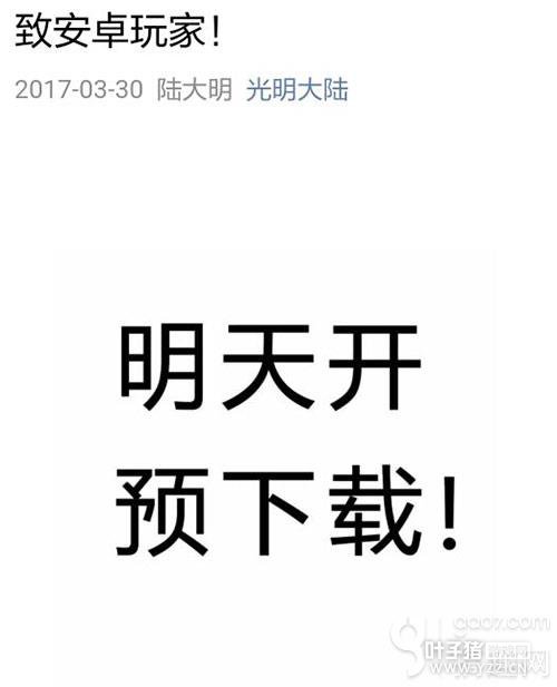 光明大陆3月31日安卓开启预下载,届时安卓玩家可提前创建角色,但不能进去玩。 下载地址:请戳这里<<<(3月31日同步更新) 网易官方下载地址:请戳这里<< (提示暂未开放,说明官方还没开下载, 可以过会试试) 会提前开服吗? 安卓公测时间是4月6日,但不排除提前开服(不删档?) 因为iOS就是这个套路(3月31日公测,3月27日就已经可以玩了) 敬请期待。 官方微信简单粗暴的推送: