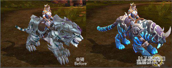 版本更新前的银翼战虎即是坐骑中的高人气成员,合体的银色盔甲使它显得英武非凡,但给人的印象却仍是以“防御”为主。而在更新后的版本中,战虎的盔甲不仅多了雕刻细节,造型立体感更加强烈,头顶尖角的设计也显得杀气十足,更具攻击性。此外,光效与虎身纹路的搭配不仅在百兽之王的霸气成功融合了风雷质感的魔幻效果,更使得 “战意”汹涌而出,完美契合了“战虎”的名号。