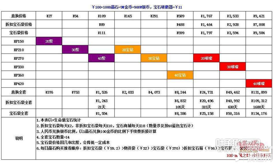 宝石这个,完全是自觉花钱无度了,本来信誓旦旦要一身宝钻的。。。然后做完表以后吓尿了,啊哈哈哈。。。 大家看这个的时候,先看中间色块,然后左边对应的是血量加成,上面对应的是各种方式获得的人民币价格,下面就是全套的价格。 这个表是光芒石各种级别的对拼,希望能给大家提供帮助: