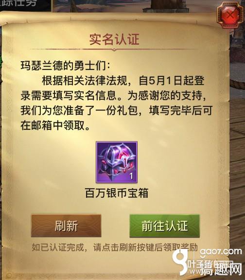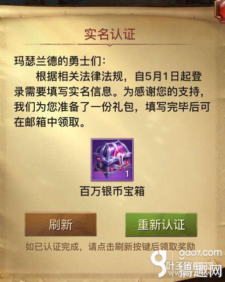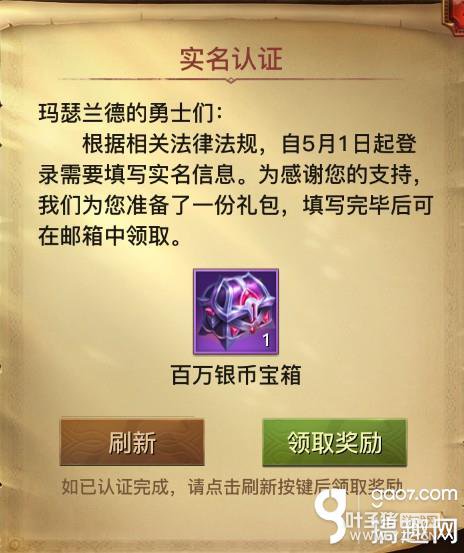 移动端 三、奖励领取 填写完所需信息后,点击“确认登记”,再返回游戏点击提示界面中的“刷新”!注意到了吗?之前显示为“前往认证”的绿色按钮变成了“领取奖励”按钮。 接下来你懂的!百万银币分分钟到手!