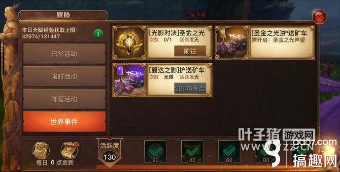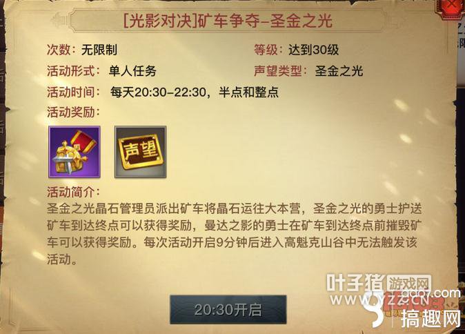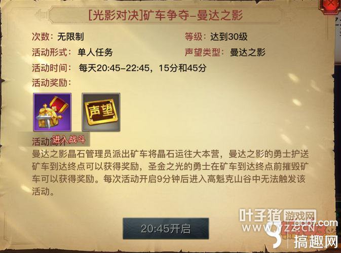 然后就是阵营的护送矿车任务,活动时间如下图,每天可以抢劫对立阵营矿车和护送己方矿车各一次,每次成功奖励400荣誉和750点阵营声望,失败奖励略少。注意活动开始9分钟后将无法参加,只能等待下一次开启。