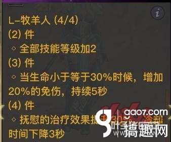 ①熟练:娴熟和熟稔都点上。对秘能盾的提升相当高啊。就一般而言,加满是35。就提升17.5%,冷却时间大概0.9秒吧。如果你在凑一个羊群两件套,那效果就很棒了,一个盾可以给T提供一半血量的伤害吸收。 ②第一美德:高尚和良习都可以加上吧,如果符文紧张就先加高尚。毕竟我们大部分时间还是用平A加血的。提升暴击率对加血量也有很大的提升。说实话,高尚这个技能我相信大部分人都觉得有点鸡肋了。我们牧羊人暴击的概率本来就低,暴击后出现美德效果也只有五分之一都不到,就算出现了,大部分情况大家也都是满血的,所以这技能就是纯粹看运气吧。可能有的时候能有救命的效果,但是至少我现在还没有碰到。 ③常量:看自己爱好吧,如果你喜欢pk,喜欢战场,建议加上。有的时候觉得战场,阵营,pk都是看哪部控多哪边赢。增加点抗性,有的时候也有力挽狂澜的效果。如果至少平时做副本,那就不要浪费了。 ④原始契约:我看有的人加了,我反正没有加,我是牧羊人,基本不会去打输出的,而且现在右手这么多,右手肯定也会去点这个符文,我们也没多大必要去浪费这些符文。当然,如果你有钱就当我没说咯。 ⑤敏锐:洞察必须加满,不说其他,对秘能盾+螺旋丸这套组合技能提升很大,完全是起死回生的效果。至于幽影。。。如果你有一个输出的心而且符文多的发慌,那就随你开心。 ⑥绝对真理:两个都满上吧,秩序之地毕竟是后期开荒的主技能,而且蓝色符文你不加这个还能加哪个呢。 其他的符文我建议都加到6级,毕竟每点一个能加一点血。都点到六也能多将近一百的血,而且消耗的符文碎片也不多,而且一些不常用的被动,偶尔还是有意外效果的。 (二)套装选择 牧羊人套装: