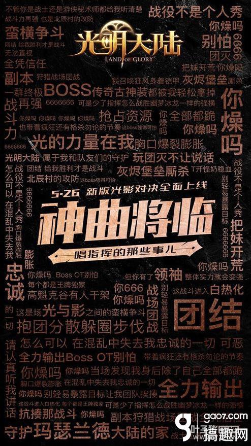 全民指挥赛火热进行 指挥神曲云音乐明日首发为了庆祝新版本【光影对决,阵营之战】上线,《光明大陆》全民指挥赛正火爆进行中,玛瑟兰德的金牌指挥家们使出浑身解数为我们带来各种战场激杀,精彩表现层出不穷。更令人期待的是,《光明大陆》特邀神秘歌手专门为玛瑟兰德大陆的指挥家们打造了一首神秘单曲,也将于明日在网易云音乐首发,一起唱响关于指挥那些事儿。那么,在强悍的BOSS面前,在光与影的激烈斗争之中,神秘歌手将燃起怎样的创作灵感呢?团队本的激战,光影之间的对抗,又将如何在音乐中展现呢?惊喜明日揭晓,与你不见不散!