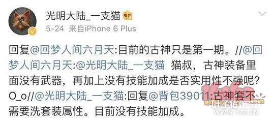 普通45级紫装上衣 从图上推测,在同样的阶级,古神的基础属性应该是不弱于传奇装的,如果按照古神6次满阶,传奇8次满阶计算,那么最终,传奇装备的基础属性将比古神高20%左右,两者皆完爆45级紫装的基础属性。 四、古神装备浅析及推荐搭配(仅限角斗士) 先放几张猫叔微博中关于古神的留言答复