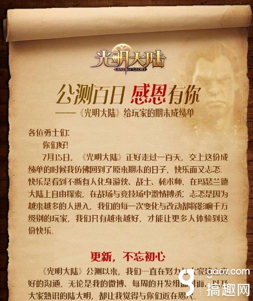 从4月6日到7月15日,不经意间,《光明大陆》公测已走过百日,游戏制作人今天特别发布了感谢信,感恩公测期间所有勇士给予的喜爱、陪伴与支持。与此同时,《光明大陆》玩家议会活动也将开启,勇士们可以就“职业、装备、日常、社交、PVP、其他”六大议题提出自己的看法和建议,游戏光明的未来将由大家携手创造。怎么玩你来定! 公测百日感恩有你 来自制作人的信 7月15日,《光明大陆》正好走过一百天,游戏制作人用一封信讲述着过去和未来。制作人在信中表示,在公测百日里,勇士们的喜爱和建议,让《光明大陆》不断优化迭代,有了光影对决、全民减负以及风语系统的深度社交等等深度改变,但游戏改善的空间依然巨大,在复盘游戏存在的不足和大家的真实需求后,《光明大陆》未来会继续朝养成轻量化、自由化、交互化、休闲化四个主要方向发展,在推出大玩法的同时,也会持续打磨细节优化体验。