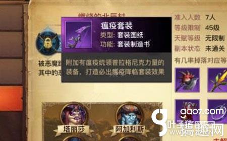 瘟疫套装: 类型:套装图纸 功能:套装制造书 附加有瘟疫统领普拉格尼克的力量的装备,打造必出瘟疫降临套装效果 获取方法:通关燃烧的北辰村可获得,击杀普拉格尼克有机会掉落。