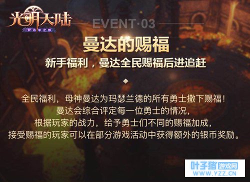 新手福利 曼达赐福战力追赶 全民福利惊喜送上,母神曼达为玛瑟兰德的所有勇士撒下赐福!曼达会综合评定每一位勇士的情况,根据战力给予勇士们不同的赐福加成,接受赐福的勇士可以在部分游戏活动中获得额外的银币奖励。