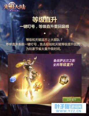 一键叮号 等级直升重回巅峰 告别了一段时间,等级和天赋追不上大部队?有了等级直升系统一键叮号,老兵回流不用再为落后的等级发愁。等级直升将免去经验和天赋等级提升困扰,为勇士们节省大量升级时间,可以快速备战全新资料片,跟战友们并肩体验前所未有的酷炫开荒。