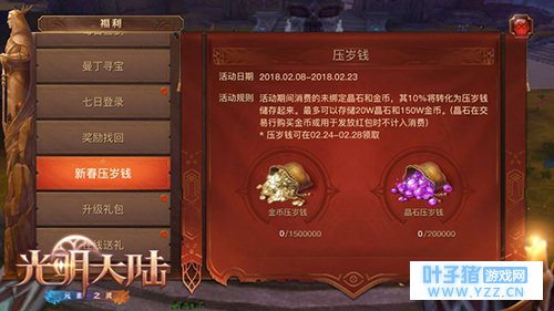 【压岁钱大红包,消费送10%返利】2月8日至2月22日,勇士们消费的未绑定晶石和金币,将有10%作为压岁钱存储起来。2月24日至2月28日放假归来时,便可领取压岁钱大红包!