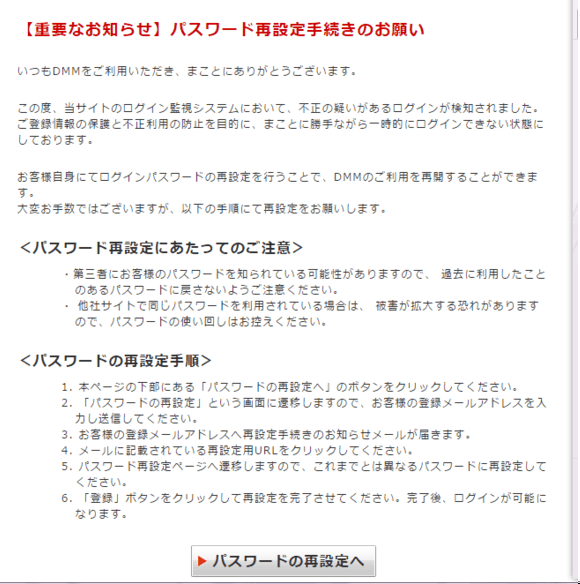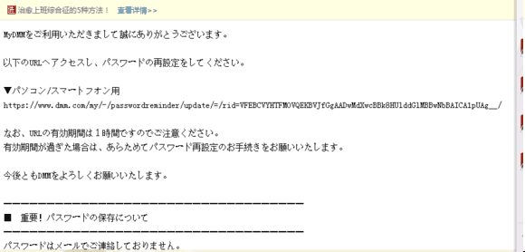 这个的意思是说账号或者密码不正确 自己好好检查一下账号密码 还有一种情况是 输入账号密码后跳转到此界面 就是让你改密码,不用担心盗号什么的,DMM会定期让你改密码或者IP发生变化的时候也会让你改密码 在这里输入邮箱 记得是注册用账号邮箱 这是输入邮箱之后的送信页面 去自己的邮箱里会找到信件 如果没找到信件记得看看邮箱的垃圾箱里面,或者检查自己邮箱是否输错了 邮件内容 最重要的是这个地址,跳转到这地址【复制黏贴懂了吧,或者直接右键】 上面输入新密码 下面确认新密码 确认完毕之后就可以登录了 好了,改密码完成 如果有人想要主动改密码,在登录账号页面找到这个 第一个选项,忘记密码那里就行了 接下来步骤同上面改密码教程 了解更多相关信息,请前往http://sy.yzz.cn/ku/djlw/ [编辑:幼儿园扛把子]