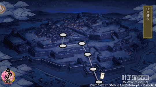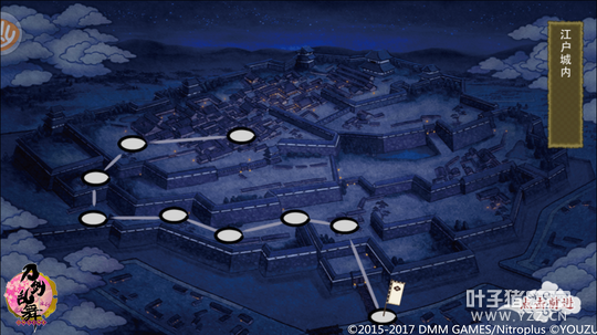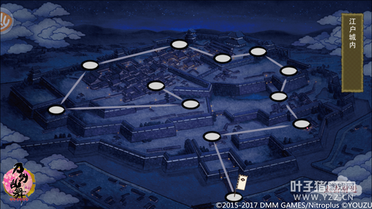 【地形介绍】 该合战场中,战斗模式为夜·屋内战。因此: 1、短刀和胁差的能力将得到提升。 2、除铳兵以外的远程兵(弓兵、投石兵)无效,但加成的数值仍然有效;BOSS点所有远程兵(弓兵、投石兵、铳兵)无效,但加成的数值仍然有效。 3、马匹的属性加成无效。 4、该合战场一共有3条路线,由于出阵部队的总侦查值不同,刀剑男士前往的路线会不同,并且每条路线遇到的敌方部队难度不同。