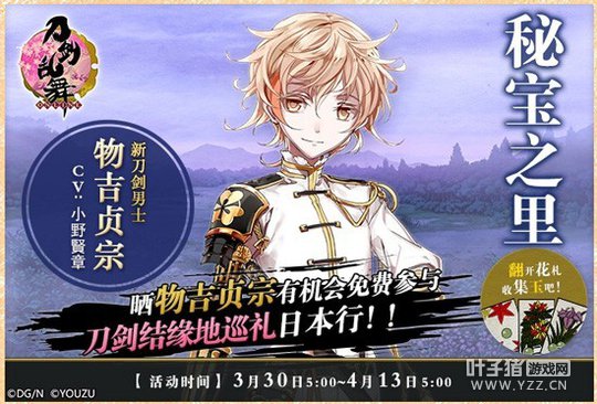 二、 获得物吉贞宗或收集5000玉 审神者们参与本次的“秘宝之里”活动,获得刀剑男士【物吉贞宗】或集齐5000玉,即可前往官方论坛参与刀剑结缘地巡礼活动的报名。 三、 参与论坛活动赢巡礼资格 审神者们在4月13日18:00前将获得物吉贞宗或集齐5000玉的截图及战绩内uid截图回复至官方论坛活动贴即可参与抽奖。 活动地址:http://bbs.youzu.com/thread/8116848-1-1.html