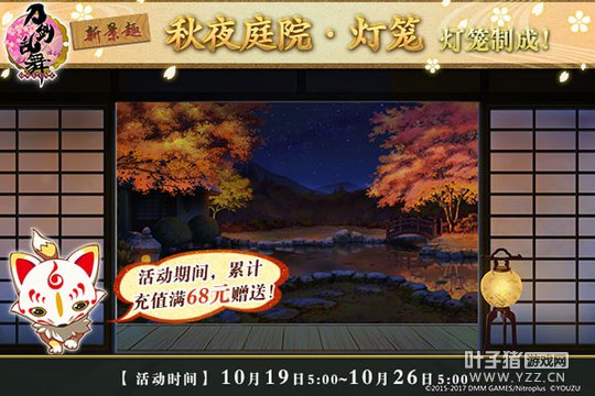 图2 《刀剑乱舞-ONLINE-》秋夜庭院·灯笼景趣 【活动时间】10月19日5:00——10月26日5:00 【活动内容】活动期间,审神者累计充值达到68元,即可免费获得秋夜庭院·灯笼景趣,与刀剑男士一起感受本丸全新风光(该景趣不能通过小判购买)。 秋夜朦胧 待君归 审神者还记得夏日庭院·灯笼景趣吗?当时上线的景趣中,还是一片生机勃勃的夏日景象,其中放置了一盏尚未绘制完成的灯笼,旁边是余温尚存的画笔。这盏灯笼是由刀剑男士亲手制作,灯笼的制作工艺需要精湛的技艺和十足的耐心,看来刀剑男士不但在战斗中英勇神武,生活中也是一位心灵手巧的男子呢!审神者一定特别期待灯笼制作完成被点亮的一刻吧!转眼之间,秋日气息愈发浓郁,在夏日精心制作的灯笼也终于完成了!秋夜庭院·灯笼景趣悄然上线!该景趣中,天高露浓,浩星点点,一片静逸柔和的秋夜之景。精美的灯笼被点亮,光辉映衬出柔和的秋夜之美,这盏亮起的灯笼是为谁留下?还是快快用秋夜庭院·灯笼景趣装扮本丸,共赏朦胧夜色吧!