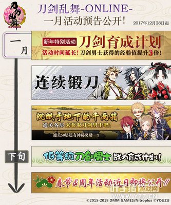 图 2 《刀剑乱舞 -ONLINE-》一月活动预告 沉眠于地下的千两箱 活动即将登场 在此活动中,审神者率领刀剑男士来到大阪城地下,通关一定的层数即有机会入手稀有刀剑男士【短刀 ·博多藤四郎】、【短刀·后藤藤四郎】、【短刀·信浓藤四郎】、【短刀·包丁藤四郎】 ,于此同时,参加活动还能获得各种资源、道具、兵装和极化道具等。另外,通关大阪城地下,还有神秘惊喜在等待着审神者! 战力育成计划 助力提升低等级刀剑男士 在此活动中,低于一定等级的刀剑男士可在活动合战场中可获得大量经验,帮助审神者快速提升低等级刀剑男士的战力! 另外,《刀剑乱舞 -ONLINE- 》春节 &周年活动即将公开,各大福利回馈活动敬请审神者期待!