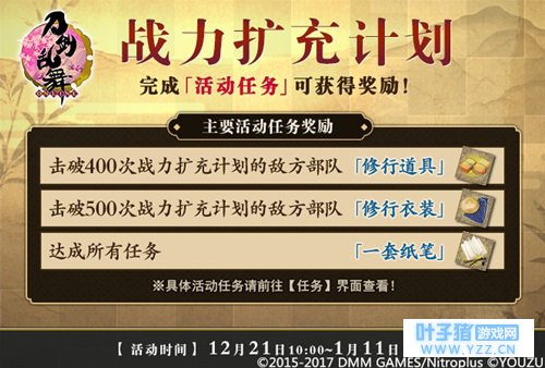 图 1 《刀剑乱舞 -ONLINE-》战力扩充计划 【活动时间】 2017年12月21日10:00-2018年1月11日5:00 【活动详情】 活动期间,审神者可多次出阵活动合战场,每次最终击败 BOSS,通关合战场,就有机会获得稀有刀剑男士 【短刀 ·不动行光 】、【太刀 ·明石国行 】、【短刀 · 太鼓钟贞宗】等等 。
