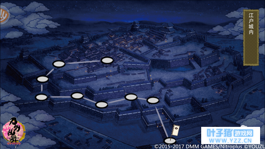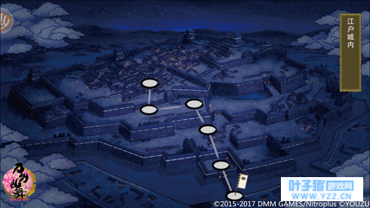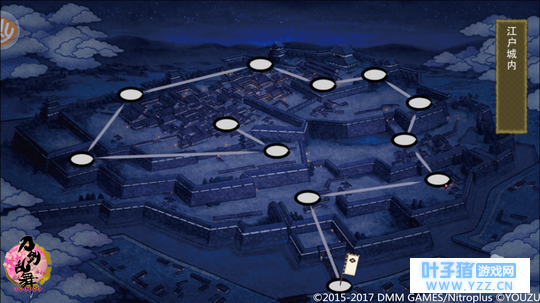 图3 《刀剑乱舞-ONLINE-》江户城内 上图为长度适中的路线,相比上一条路线,本路线的难度降低,并且对侦查值的要求也降低。因此在此路线中,审神者可在队伍中适当编入除极化短刀之外的刀剑男士,或者是极化短刀等级比较低,也可在此图练级。